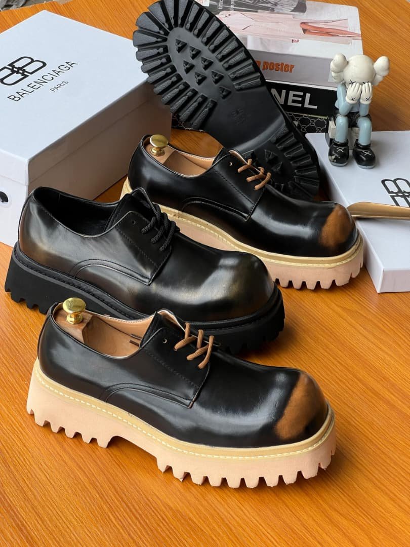These Balenciaga Derbies feature a bold and modern twist on the classic derby shoe. Crafted from high-quality polished black leather, the design showcases a slightly distressed toe finish for a worn-in aesthetic. The shoes are distinguished by their thick, oversized rubber lug soles that come in both black and beige variants, offering extreme durability and a contemporary edge. The contrast stitching and clean lace-up front complete the look. Perfect for fashion-forward individuals looking to make a statement, these shoes embody Balenciaga’s avant-garde approach to modern footwear.