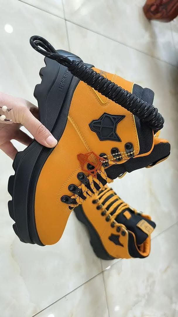 Introducing the “Wild Wolf” Combat Boots, where rugged durability meets urban style. These boots are engineered for those who demand both performance and a powerful aesthetic. The vibrant, burnt orange upper is crafted from tough, high-quality material, perfectly complemented by the contrasting black sole and details. A distinctive black “wolf” emblem on the side adds a touch of untamed personality, making these more than just footwear—they’re a statement.
